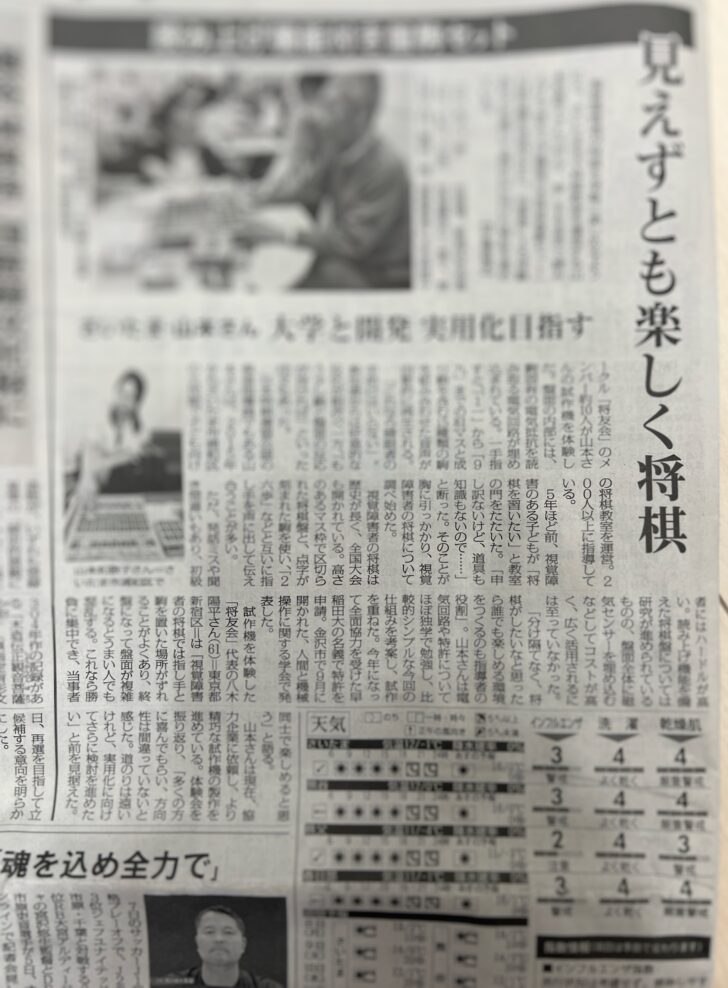 土曜日の毎日新聞朝刊(埼玉)に私の「読み上げ機能付き将棋盤システム」の取り組みについての記事を掲載いただきました。