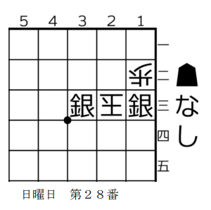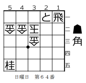 同玉か同金かで、攻めの手が変わるわけですね。このように、玉でも玉以外の駒でも取れる場所に駒を捨てて詰ますのは、3手詰のコツです。なお、初手▲5四角は△2三玉で詰まないですし、 日曜日 第64番初手▲1四角は△2三歩や△2三金で詰みません。