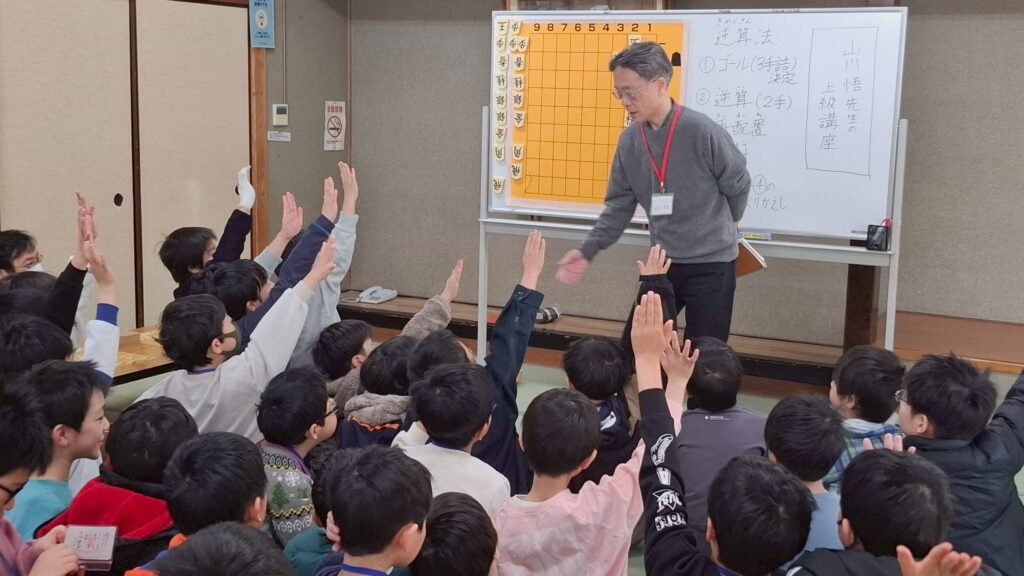 創作については今年初めての講義だったので、山川先生に創作方法の概要を30分くらいかけて話していただきました。未就学児もいるのに全員しっかり聞いていてびっくりしてしまいました。次回から15分に戻します。こうやって詰将棋って作られているんだなと勉強になりましたね。受講していない生徒さんは、絶対に見てくださいね。