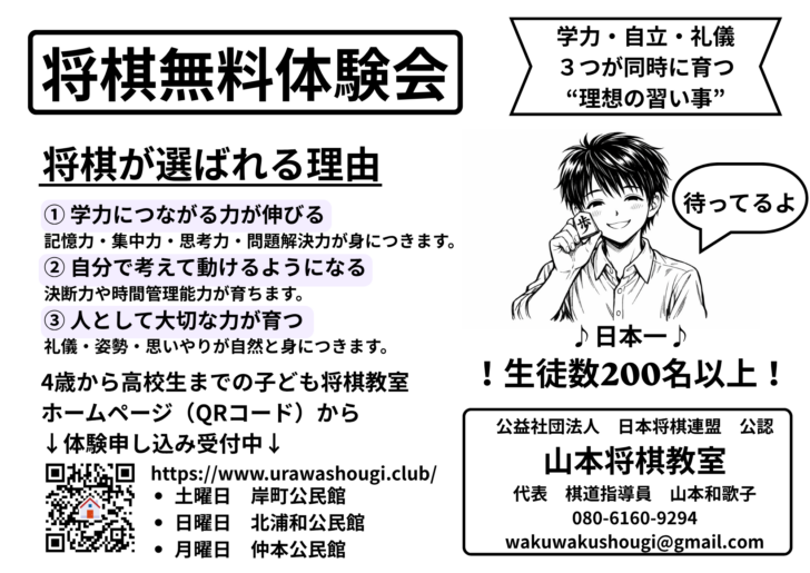 学校にまだ3名将棋仲間がいない子は、春の学校対抗の団体戦のため、是非チラシをお友達にお渡しください。