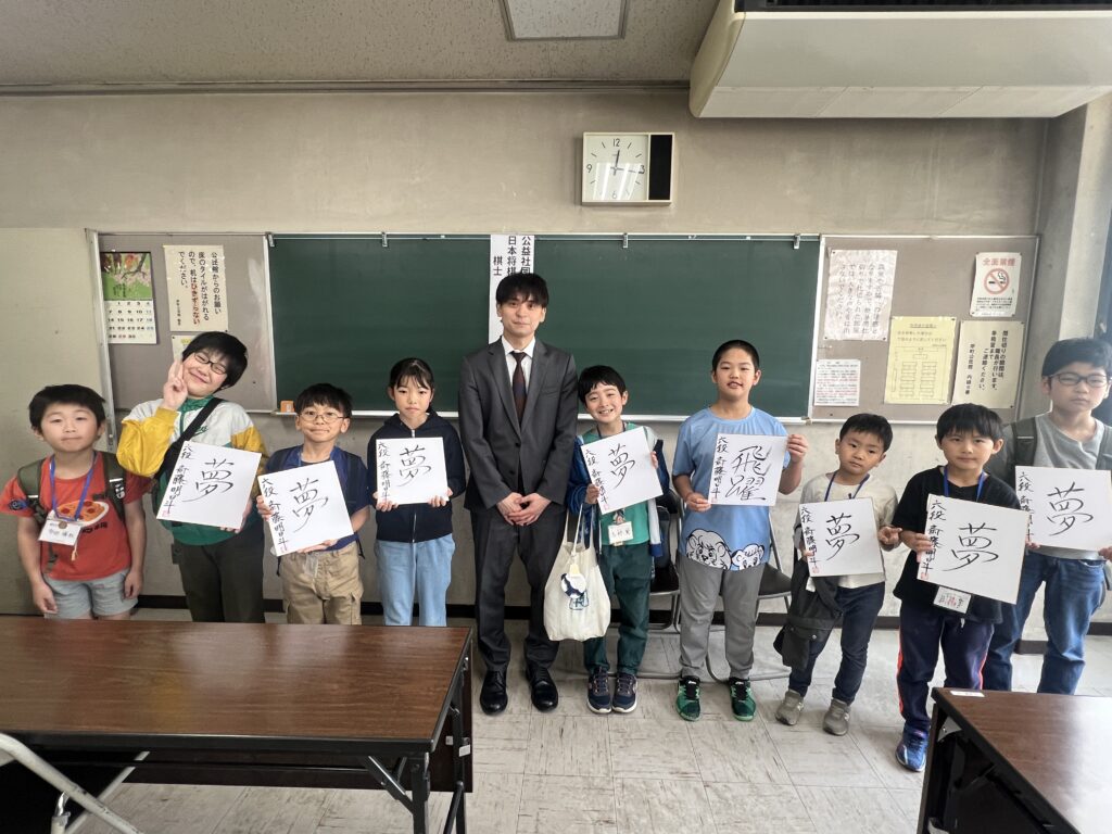 終わりの会では、5月12日に藤井聡太六冠との王座戦を控えていることについて、とてもわくわくした様子で話されていました。その姿から、やはりメンタルはとても強いのだと誰もが実感したと思います。藤井聡太先生のファンの子どもが、「どっちを応援しようかな」と明日斗先生にわざわざ言いに行くという冷や汗の場面がありましたが、さすが明日斗先生、本当にお優しい笑顔で対応していただき、先生陣はすっかりファンになりました。浦和からみんなで応援しましょう。楽しみですね。