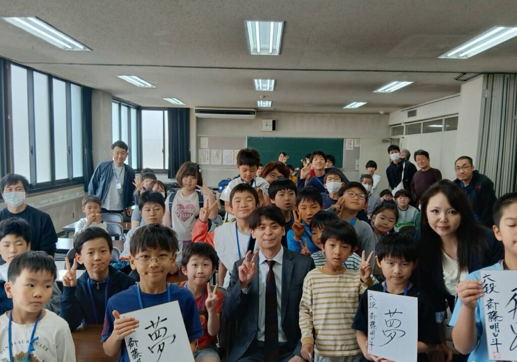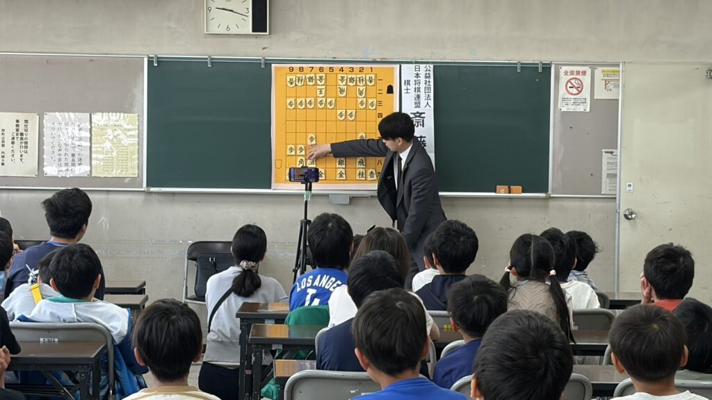 斎藤明日斗六段による棋士指導対局イベントの様子です。近隣の学校が引き渡し訓練などで不在だったこともあり、60名ほどでじっくり教えていただくことができました。会場にいる全員を一瞬でファンにしてしまうような、本当に素晴らしい先生でした。子どもたちからは「優しかった!」と、先生方からは「息子にしたい」という声が多く上がっていました。人を引き付ける魅力は、やはり優れた人格から生まれるのだと感じました。