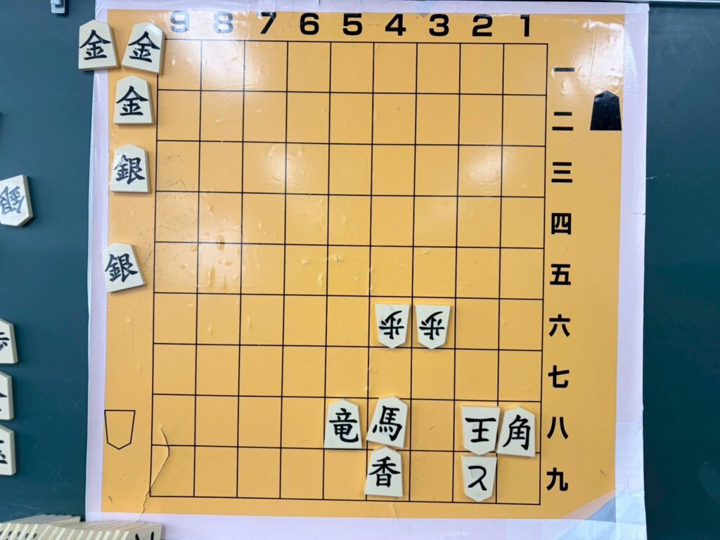 斎藤明日斗六段からいただいた大盤講義は四間飛車対居飛車の急戦についてでした。大盤に作っていただいた詰将棋です。お休みした子たちは解いてみてください。
